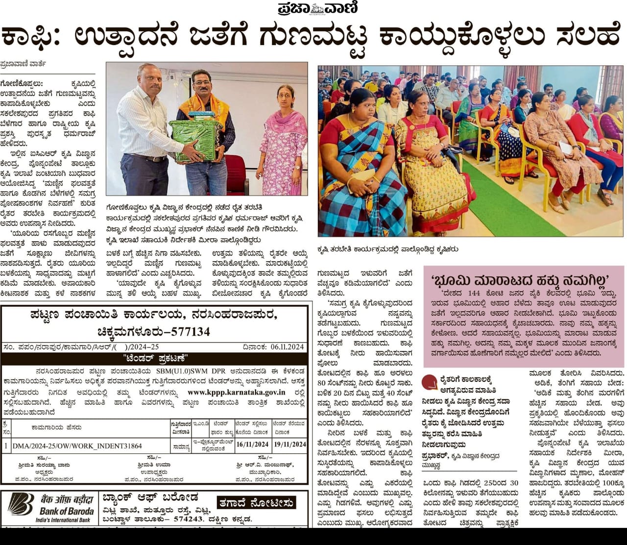 A training programme on Soil and Plant Management Strategies in Important Crops of Kodagu District was organized by ICAR-KVK Gonikoppal, Kodagu on 7th November 2024, in collaboration with the Department of Agriculture. Shri Dharmaraj, a renowned awardee and progressive planter, participated as a key resource person. During his talk, he shared valuable insights on enhancing productivity in key crops of the region, including coffee, black pepper, arecanut, and cardamom. He also highlighted his own achievement of the highest productivity on his farm, offering practical examples and strategies. His presentation emphasized several key areas, such as the importance of integrated nutrient management, farm certification, recycling of farm waste, shade regulation, and optimal plant management for sustained crop health and productivity.