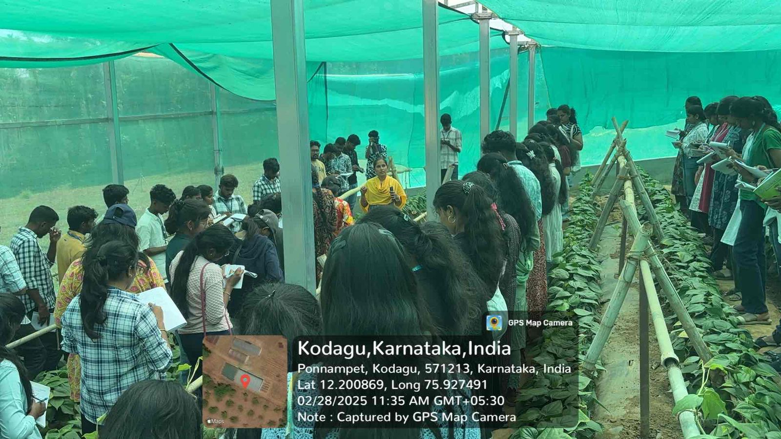 . Smt. Lakshmi R. elaborated on the propagation of pepper trellises (mother plants) and the production process for single-node pepper cuttings. She also covered the maintenance practices for both pepper and arecanut nurseries. Following this, the students were taken on a comprehensive tour of various farm units, including the piggery, dairy, goatary, poultry, vermicomposting and the farm implements & equipment room.